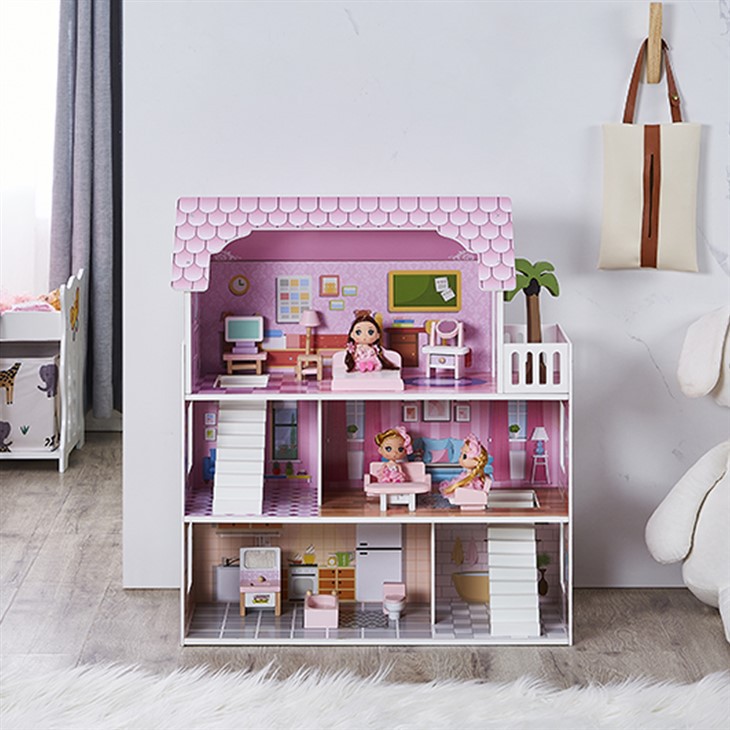 Ова дрвена кућица за лутке ружичасте боје обично се састоји од више соба, укључујући спаваће собе, дневне собе, кухиње, купатила и тако даље.